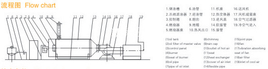 燃料通过燃烧器燃烧,产生高温燃气。并借助具有强化换热措施的热风炉将高温燃气的热量传导给被加热的空气,高温燃气经热量散发后温度降低至250℃后排到大气中。需加热的空气通过选配的鼓风机强送入热风炉,吸热后温度升至额定值从热风出口处送出,当热风温度达到额定温度上限时,燃烧器会自动停止燃烧或自动转为小火焰燃烧,当热风温度降低到额定下限温度时,燃烧器又会重新点燃运行或转为大火燃烧,升温的速度可以调节进风阀的开度来实现。